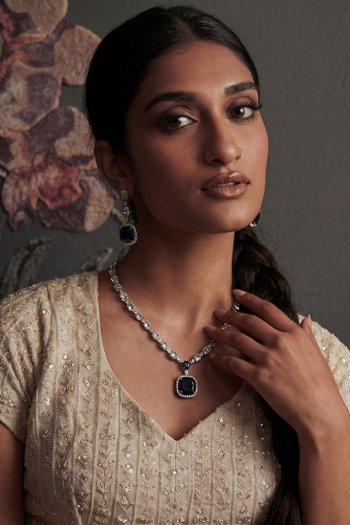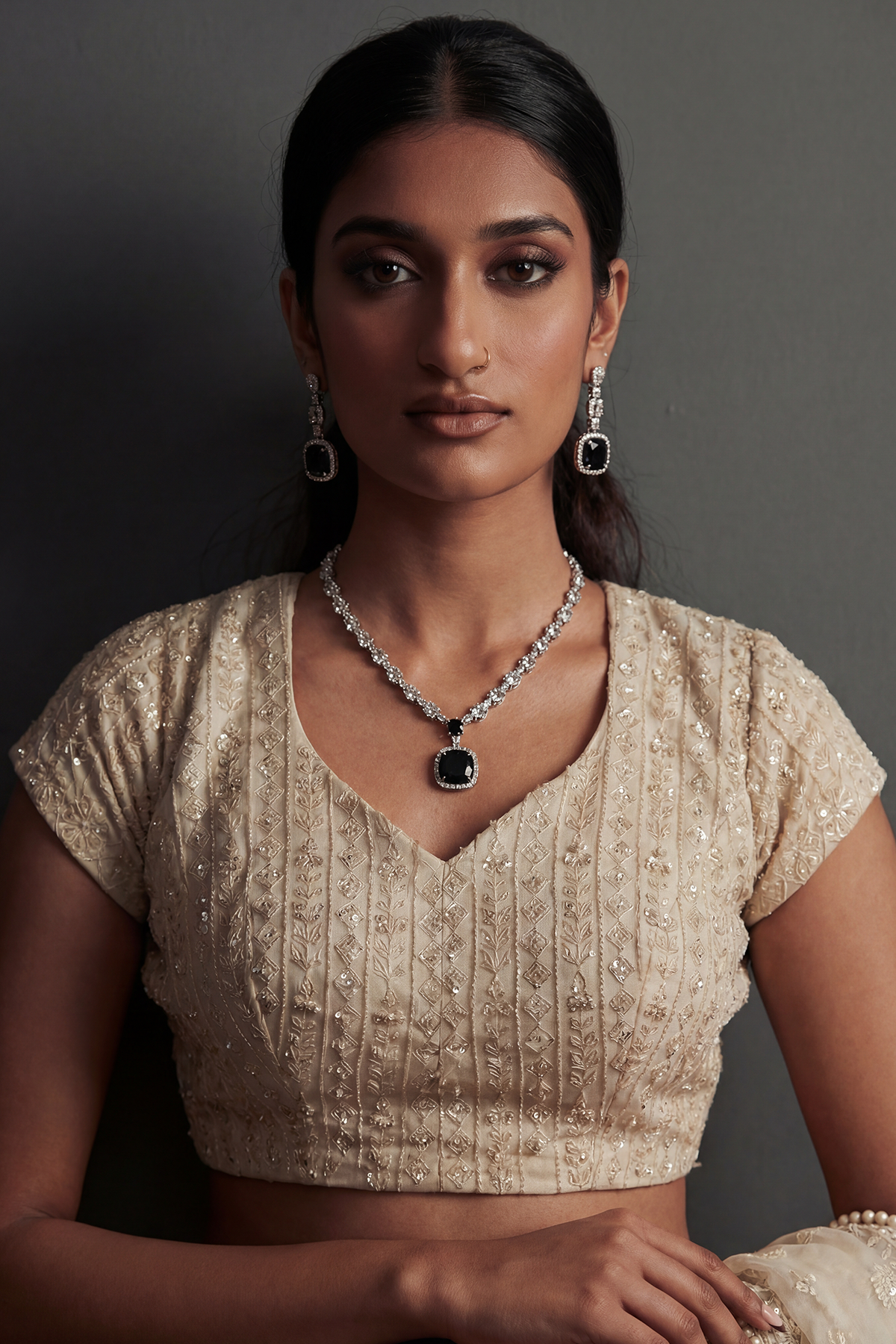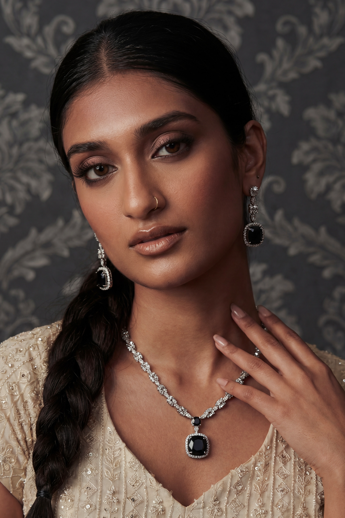 There is an undeniable magnetism in the contrast of dark and light. The Afsoon set uses the deep, light-absorbing qualities of the black stone to emphasize the brilliance of its silver setting. It is a spellbinding combination that feels both mysterious and incredibly refined, perfect for making a grand entrance.