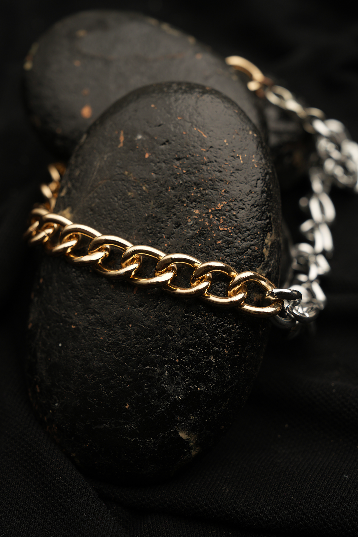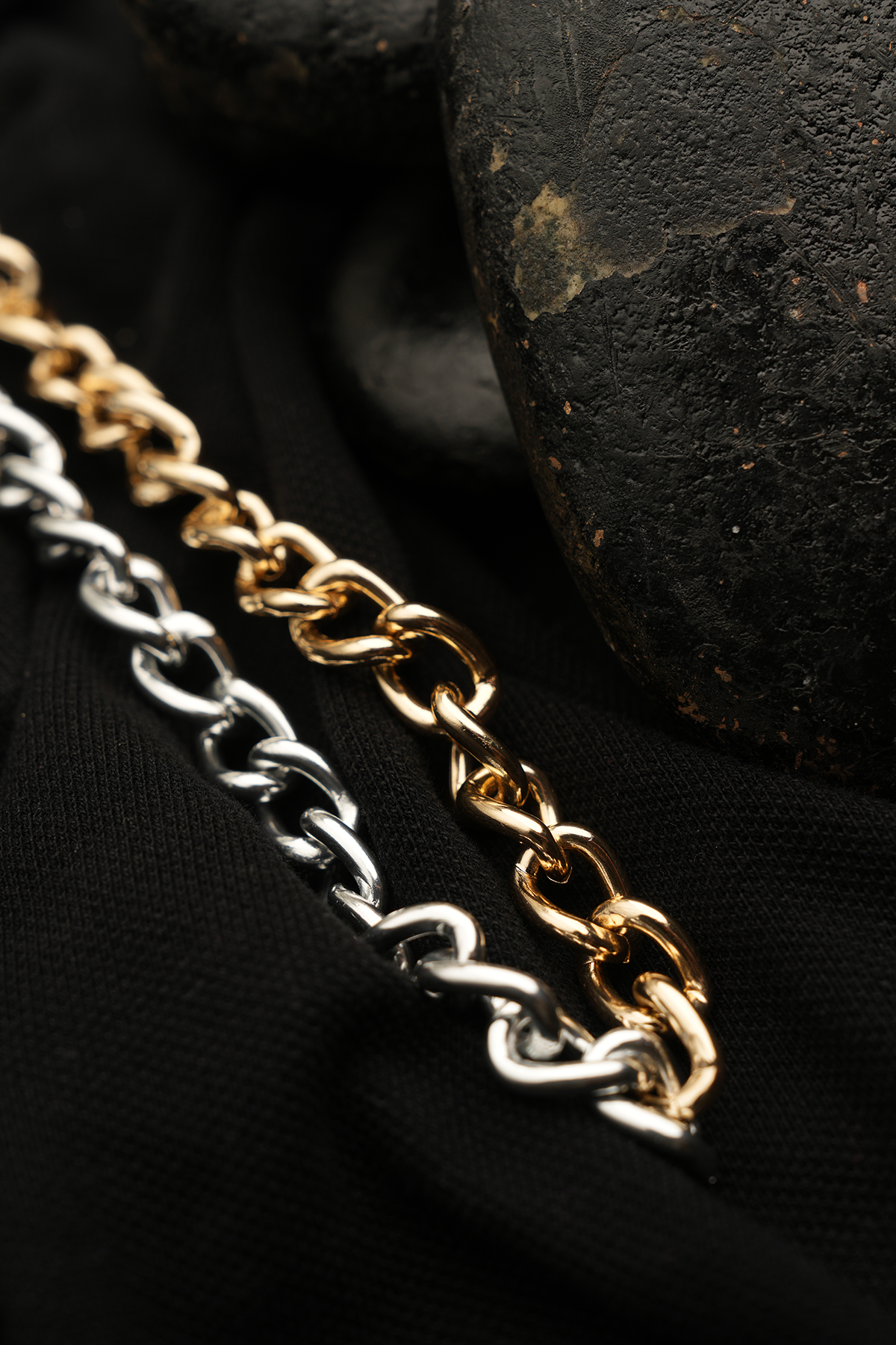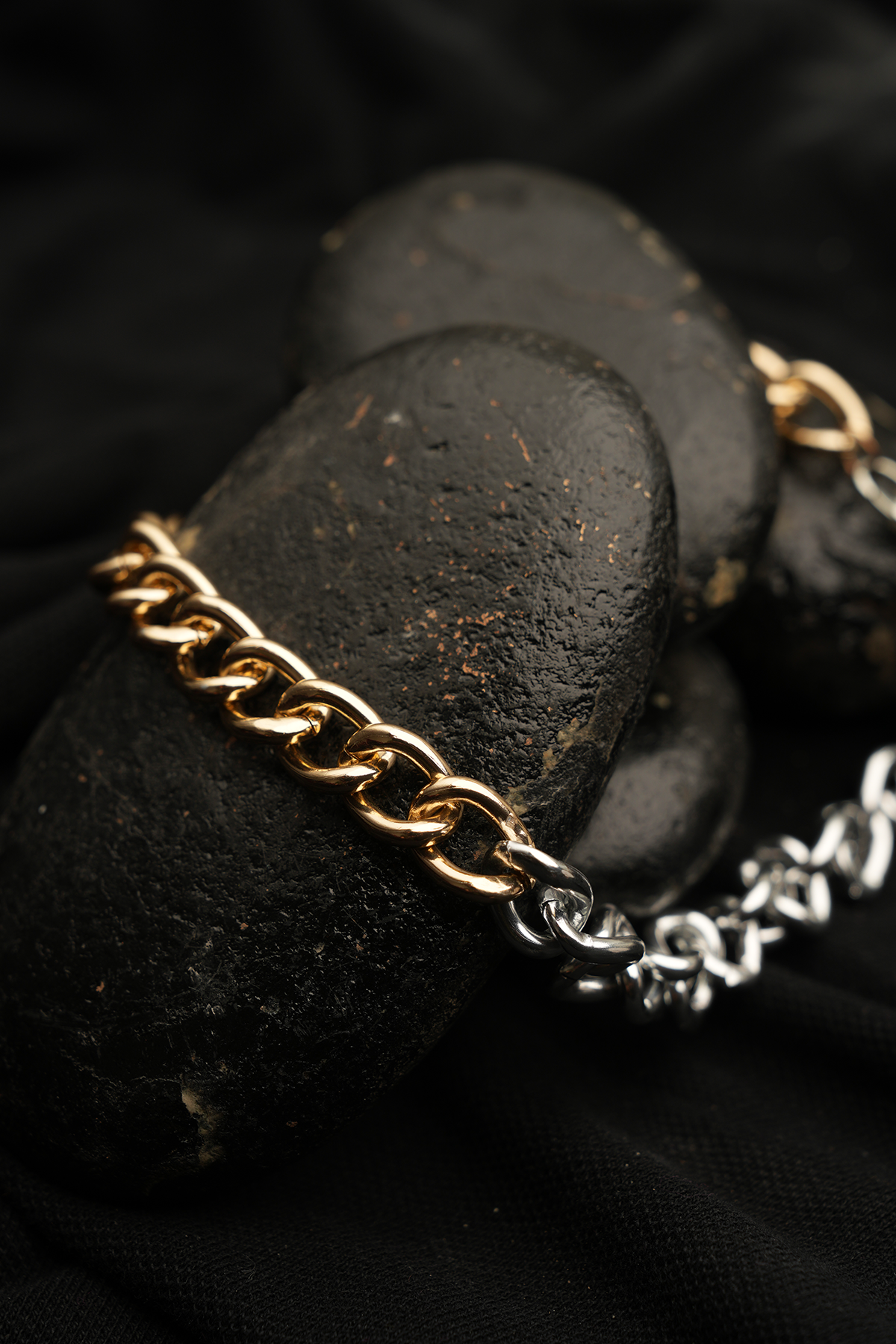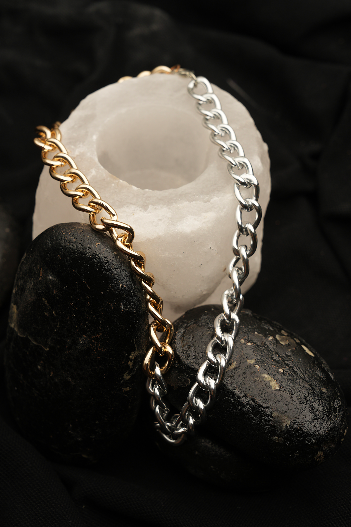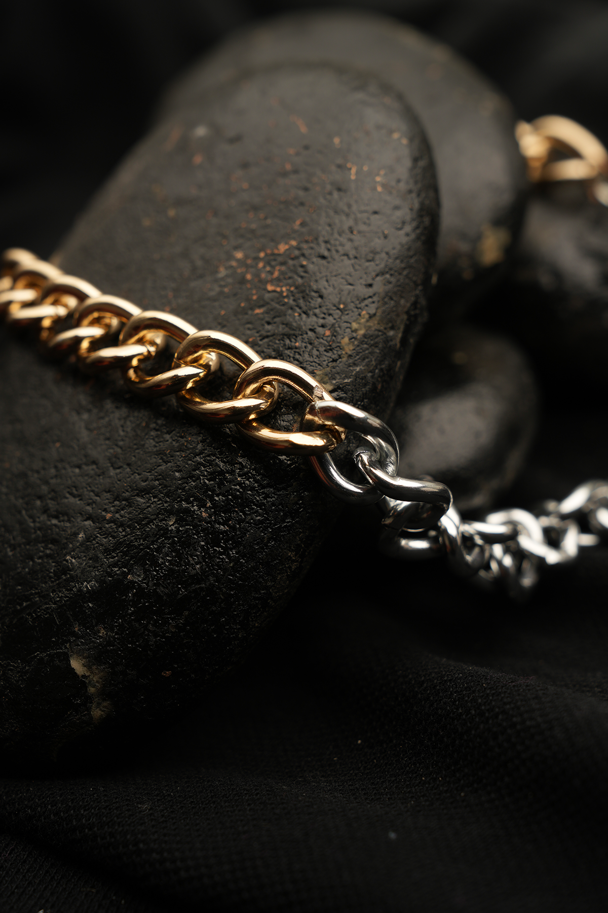 An interlinked gold and silver chain necklace adorned with striking black stone accents.