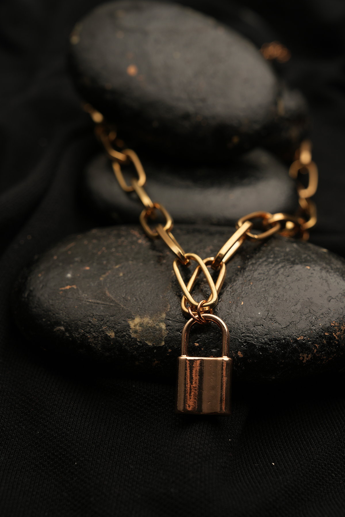A fashionable gold chain featuring a decorative padlock pendant, ideal for accessorizing your look with a trendy touch.