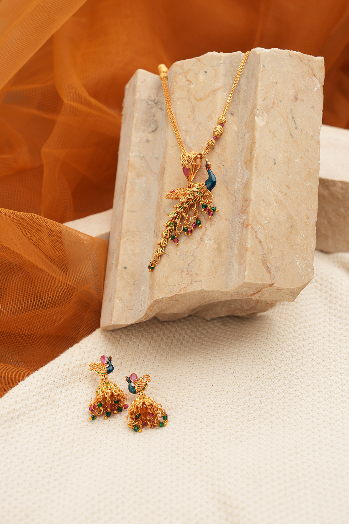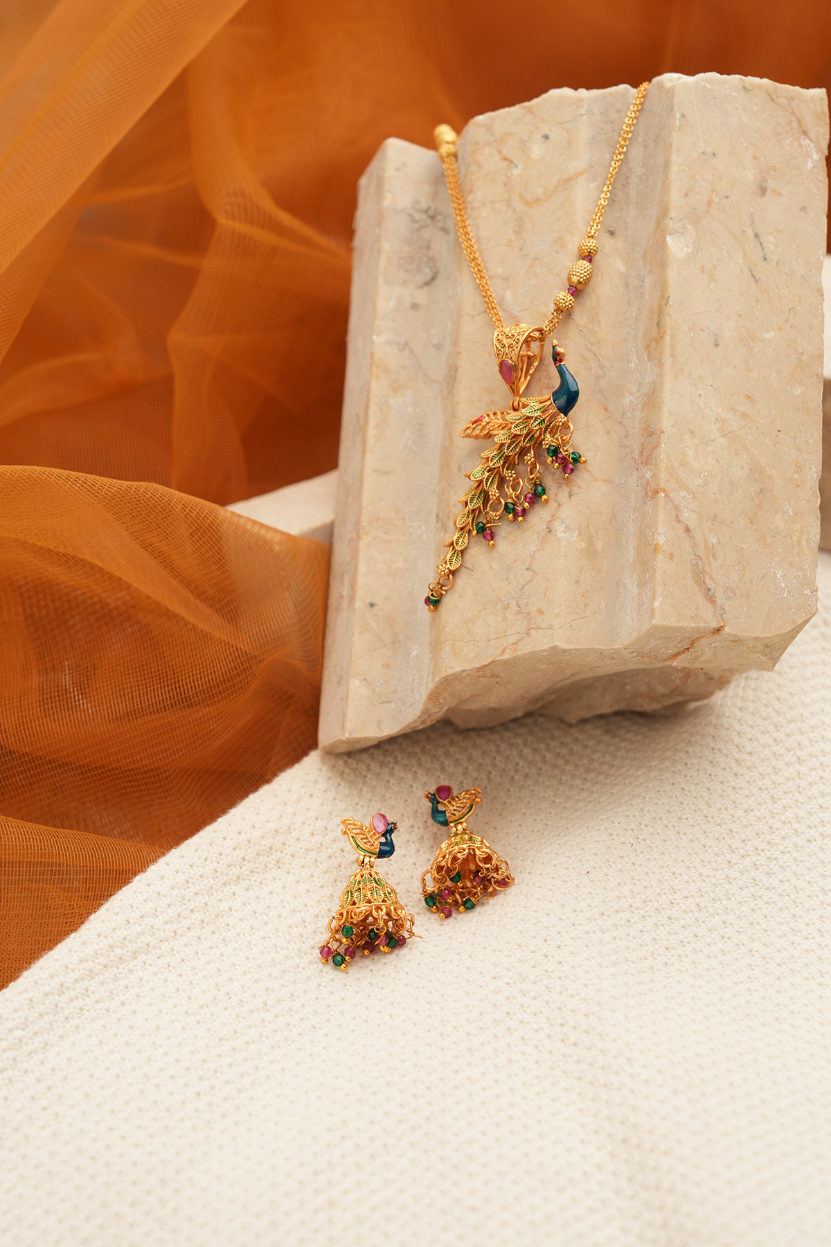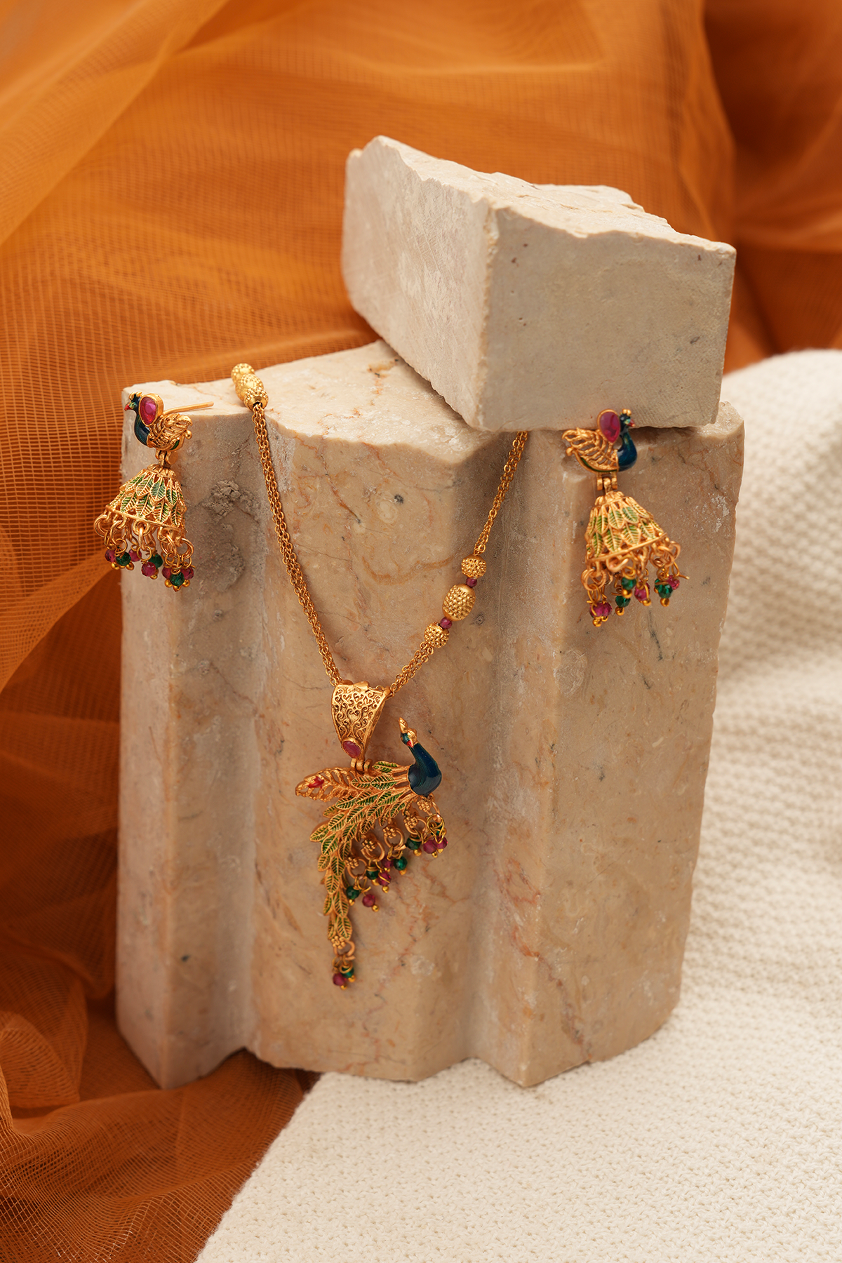 This luxurious set features a golden peacock motif adorned with vibrant gemstones, showcasing a stunning pendant necklace and matching earrings.