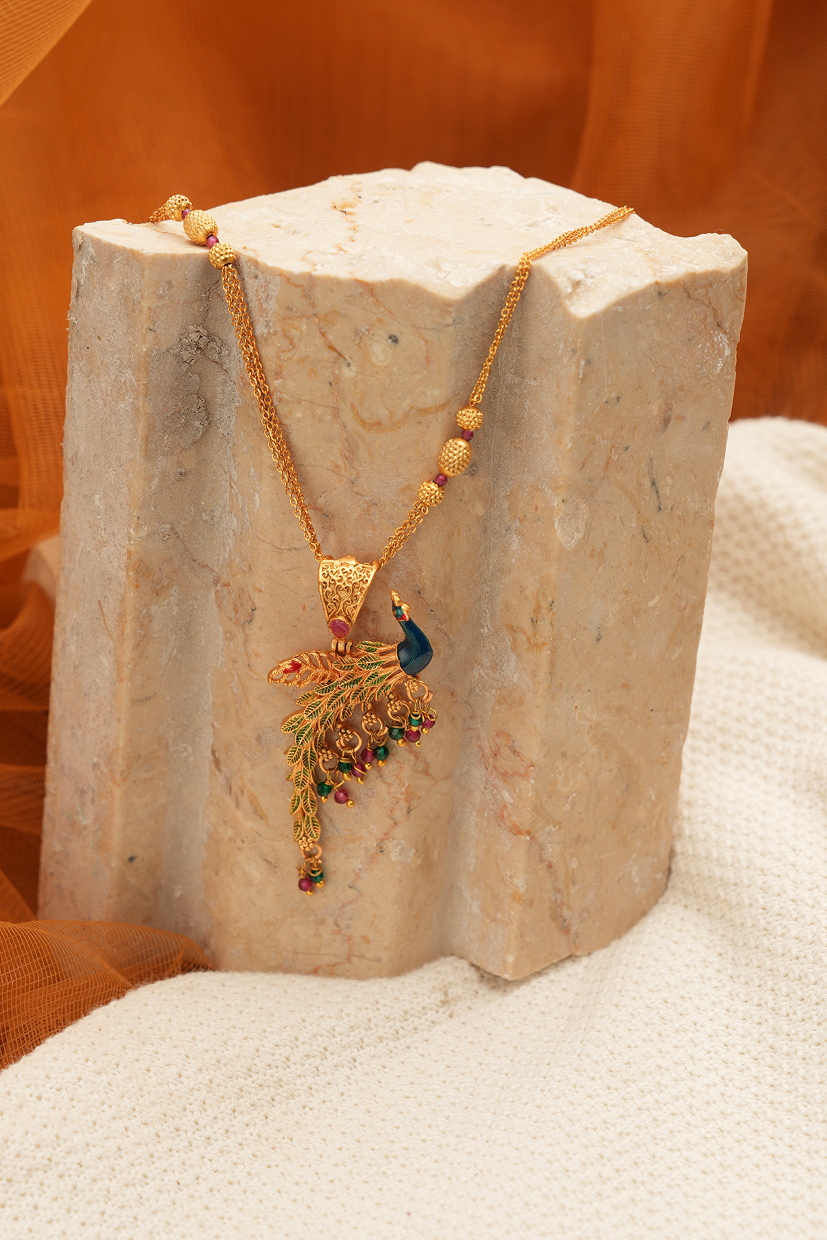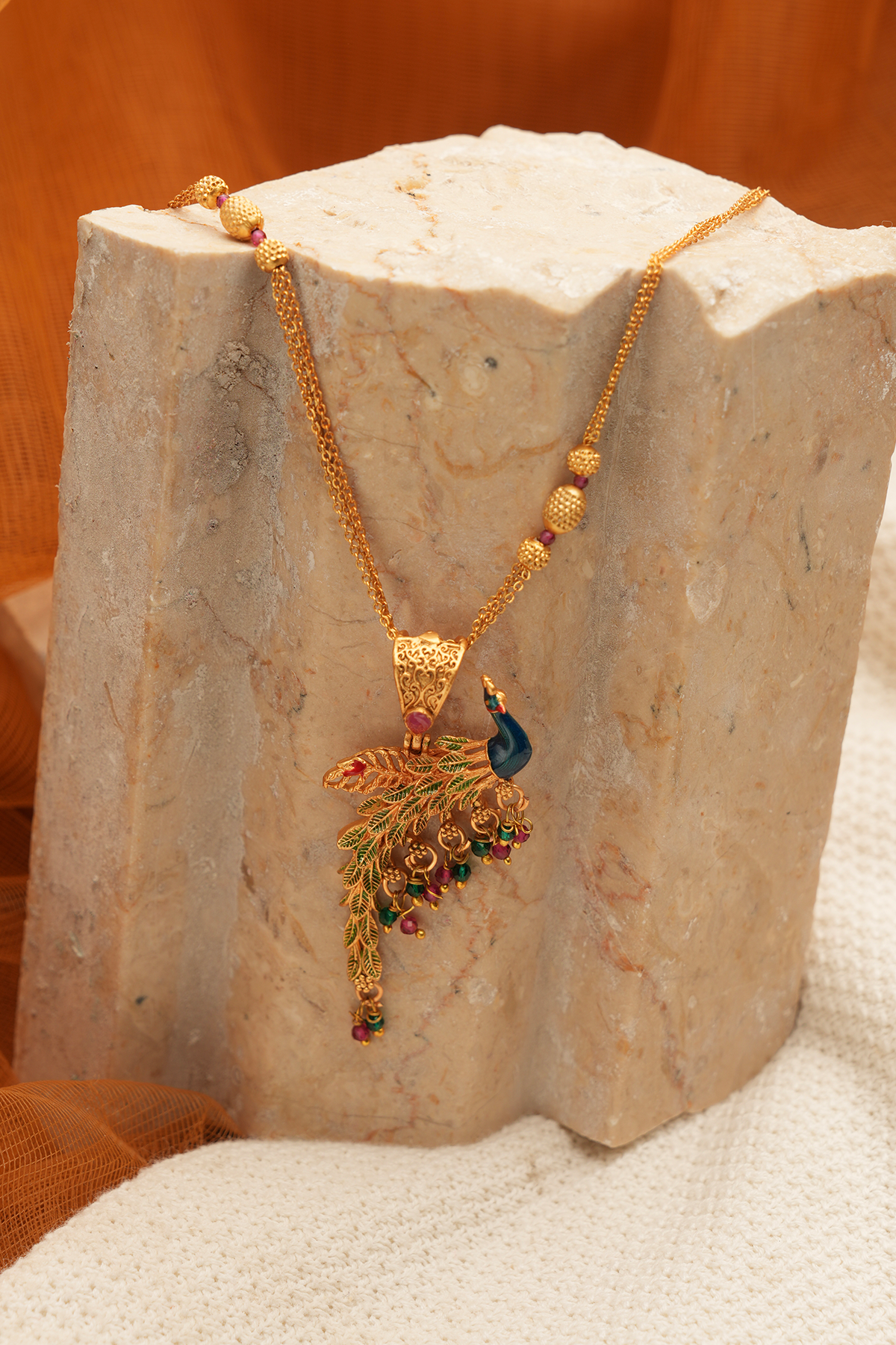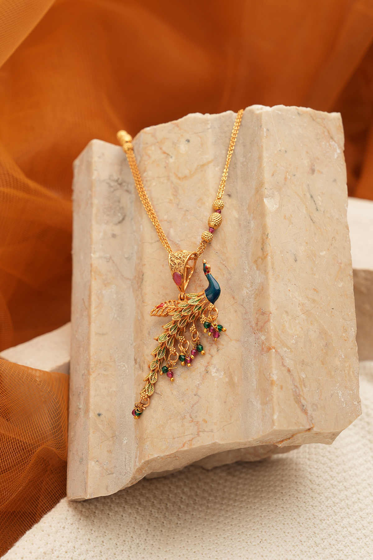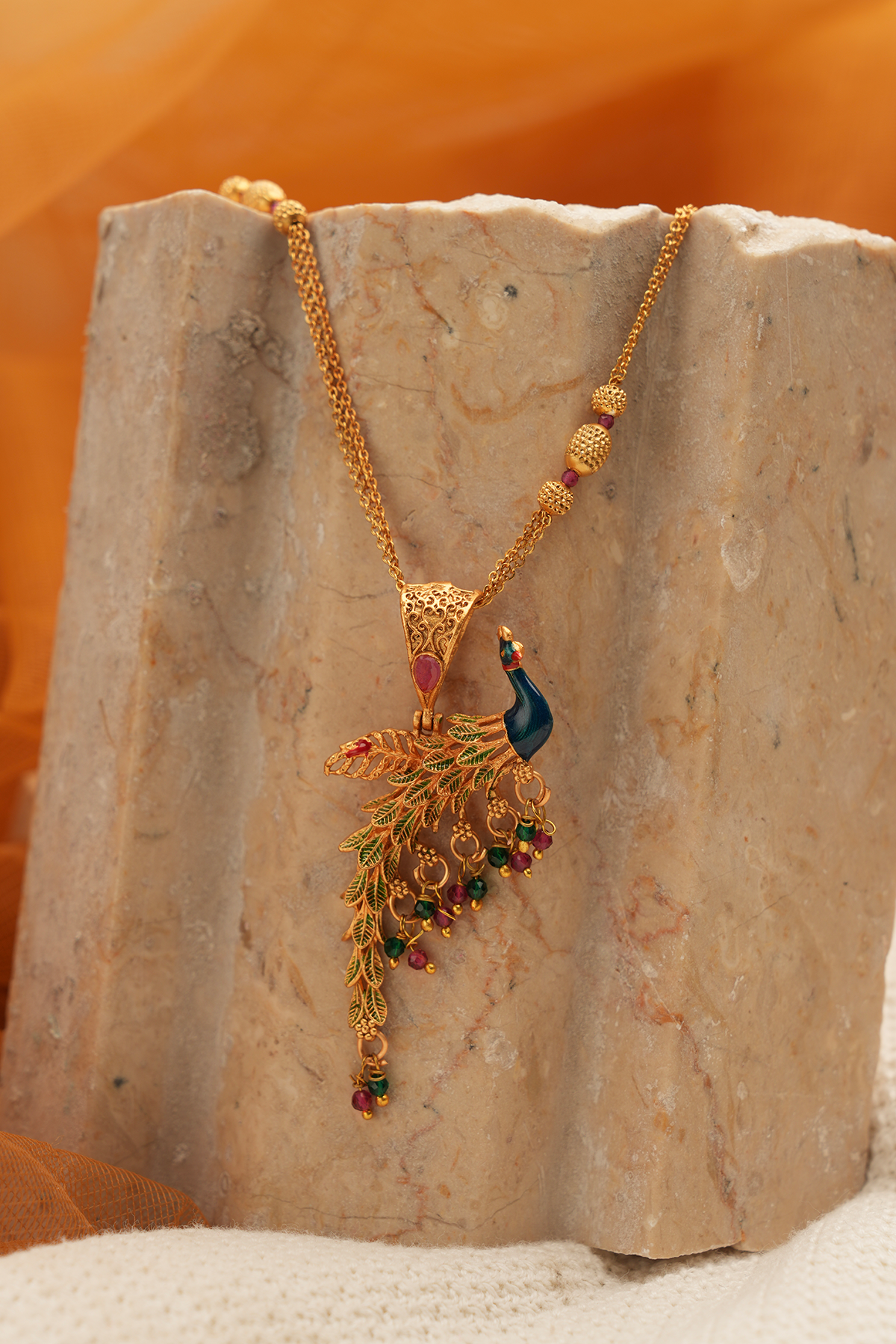 This luxurious set features a golden peacock motif adorned with vibrant gemstones, showcasing a stunning pendant necklace and matching earrings.