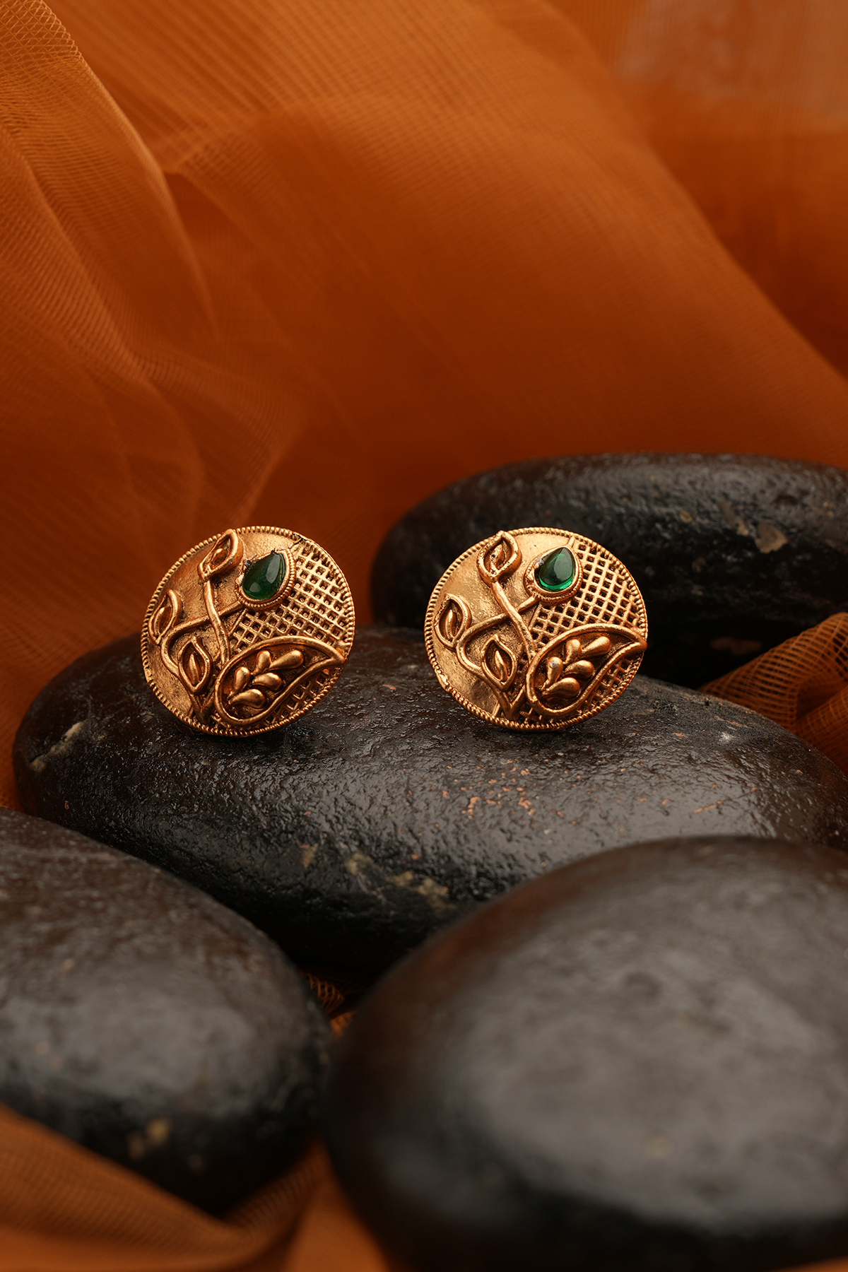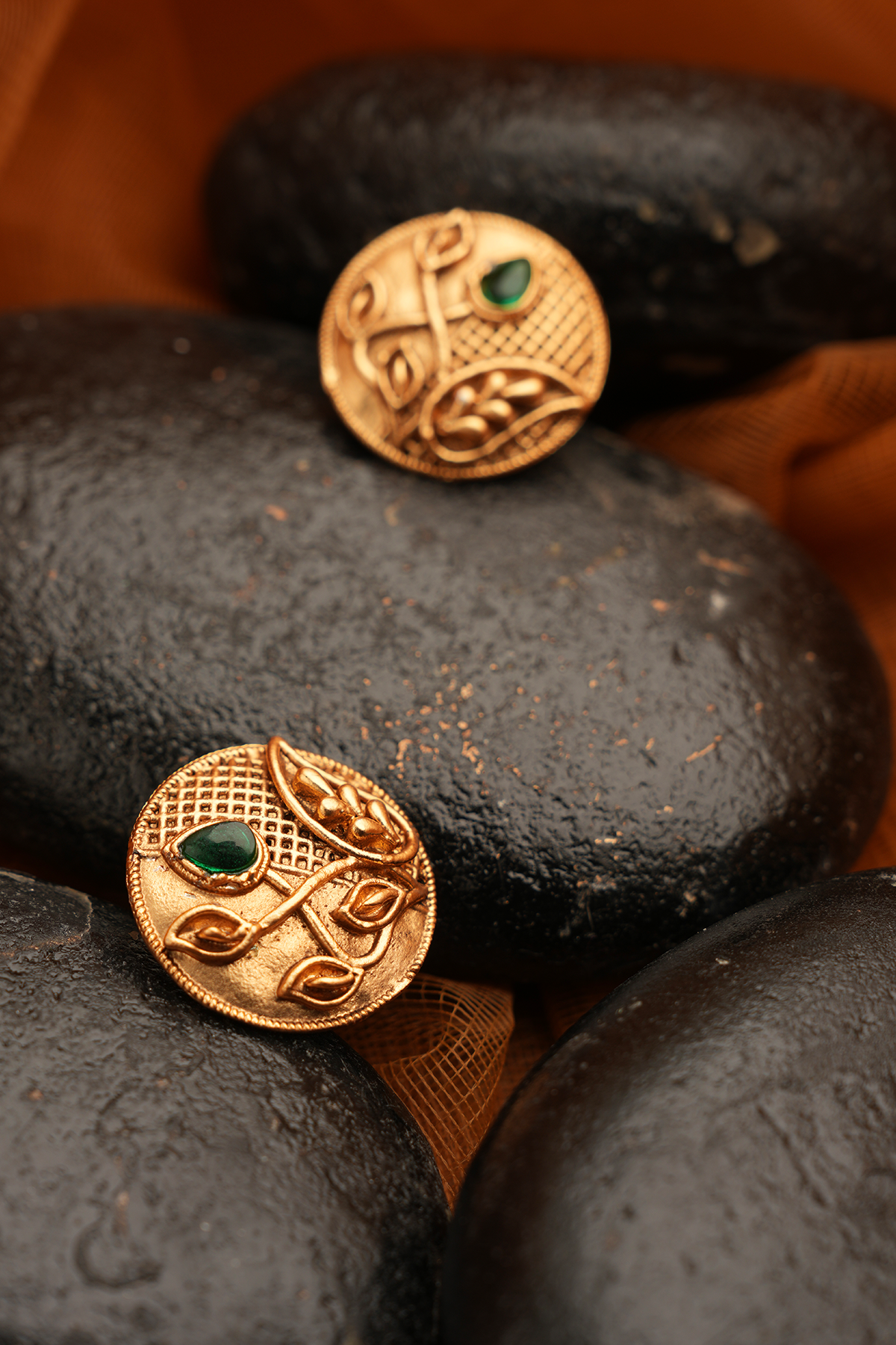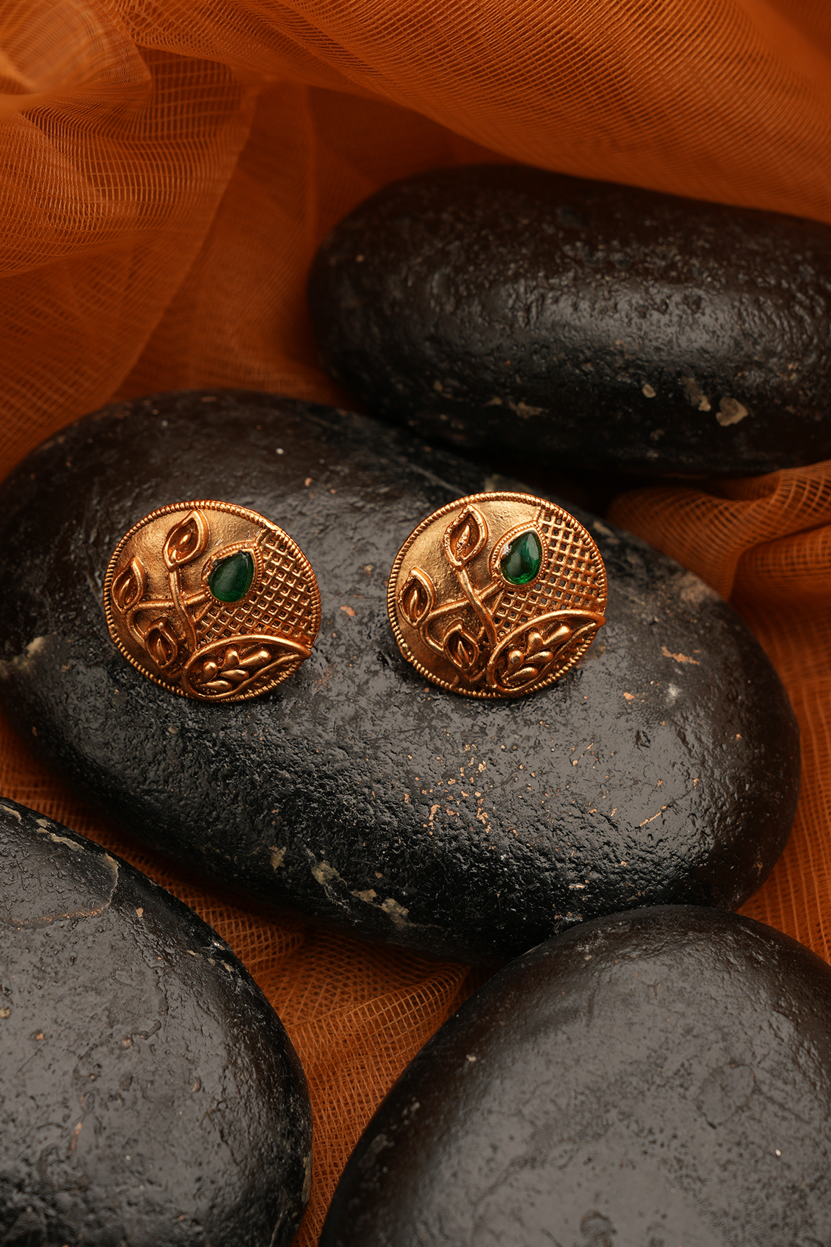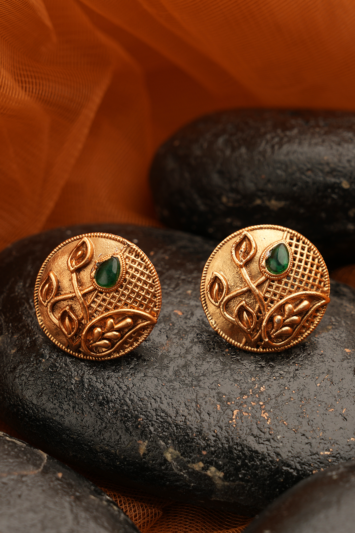 Exquisite gold earrings adorned with intricate leaf and vine motifs, featuring a stunning green stone on smooth dark stones for a touch of natural elegance.