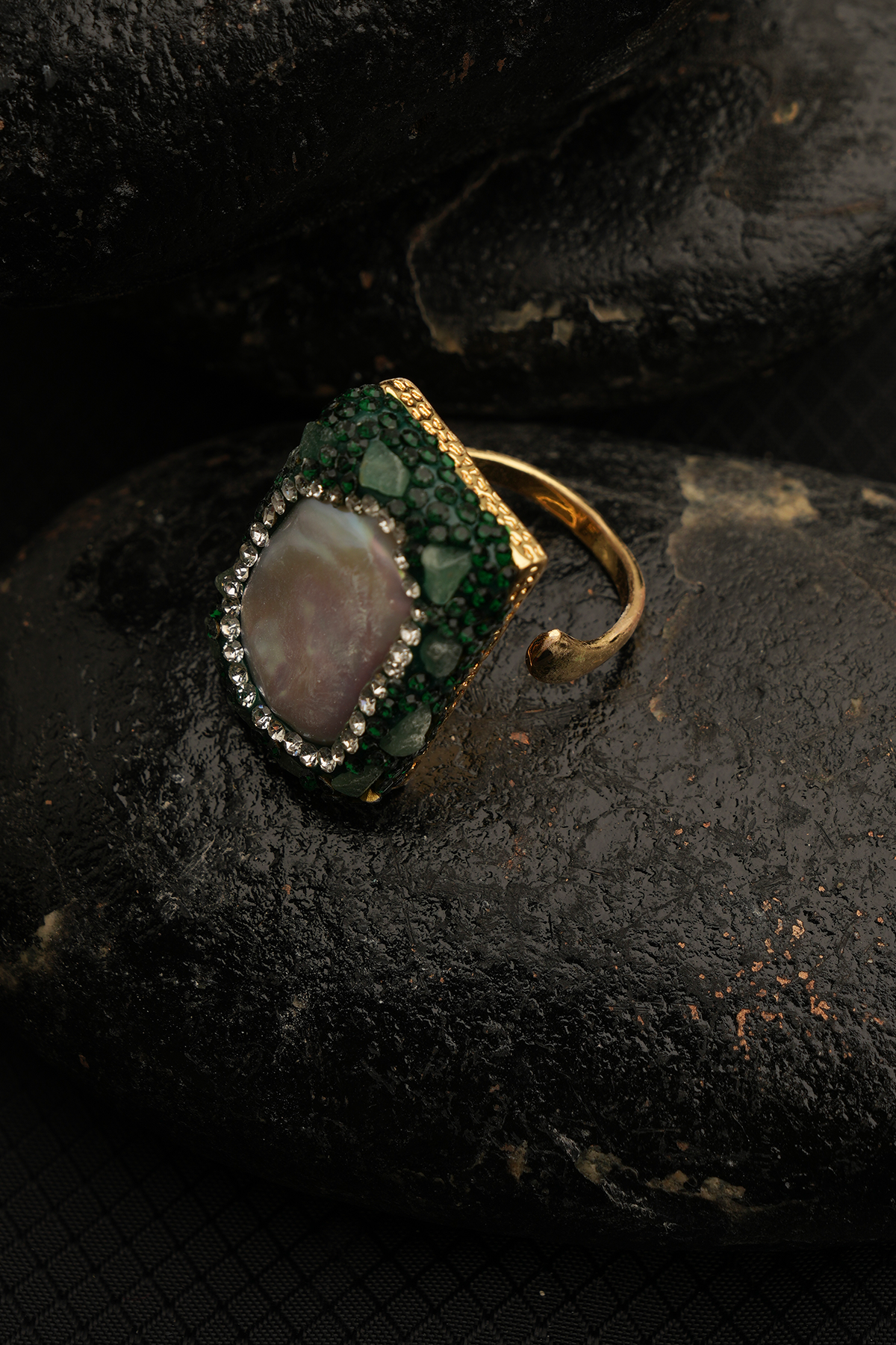An opulent ring showcasing a pearlescent centerpiece adorned with clear and green gemstones on a gold band.