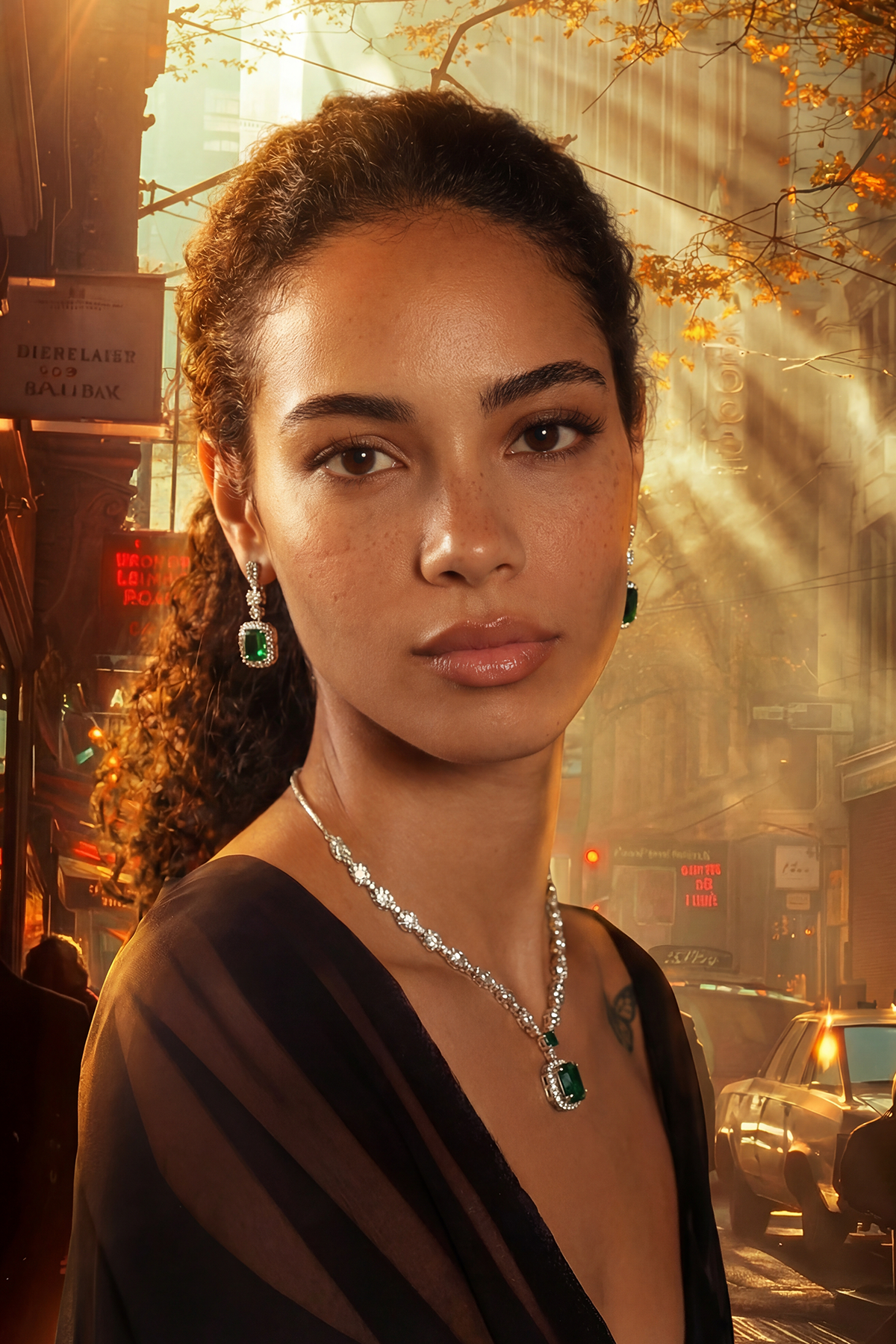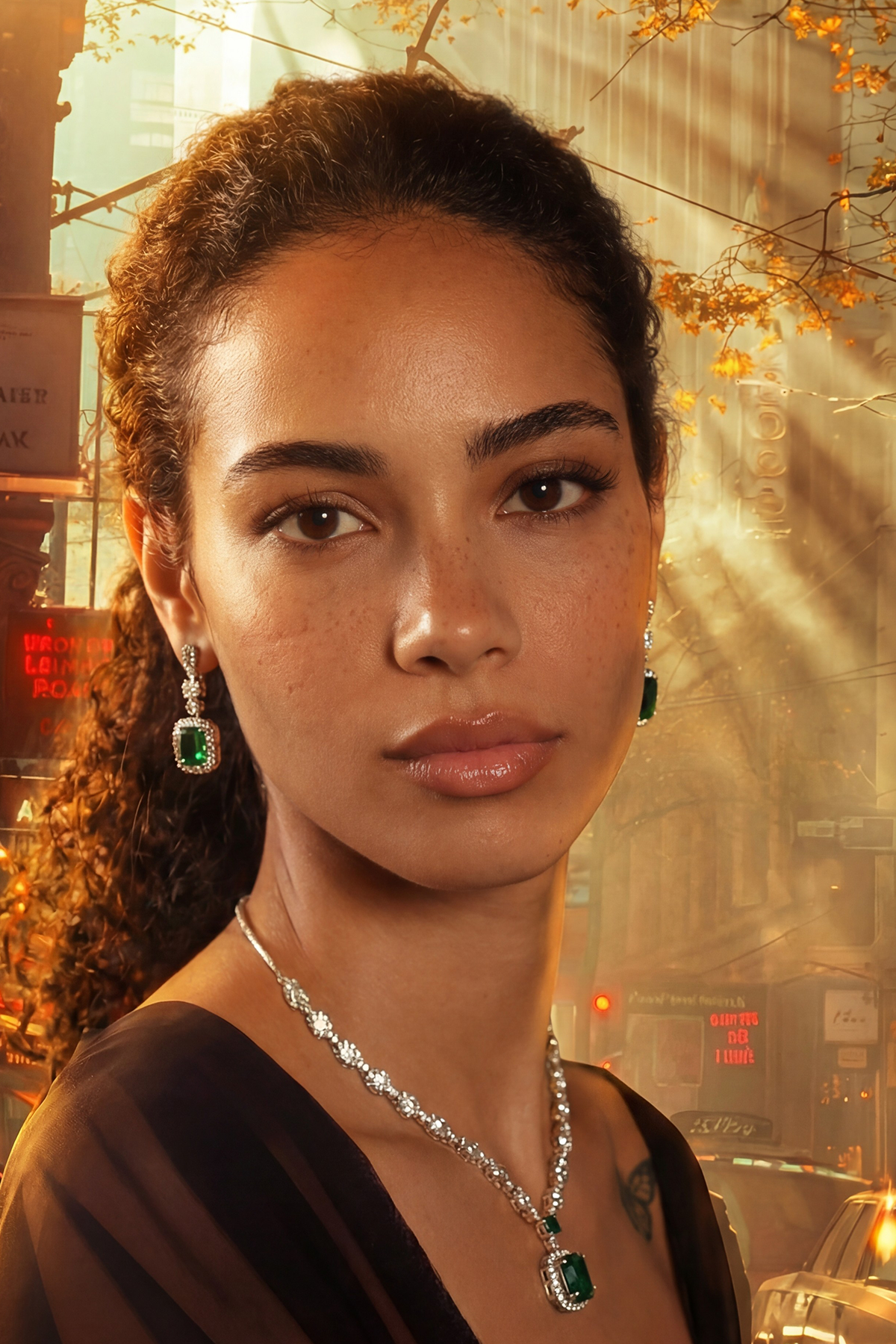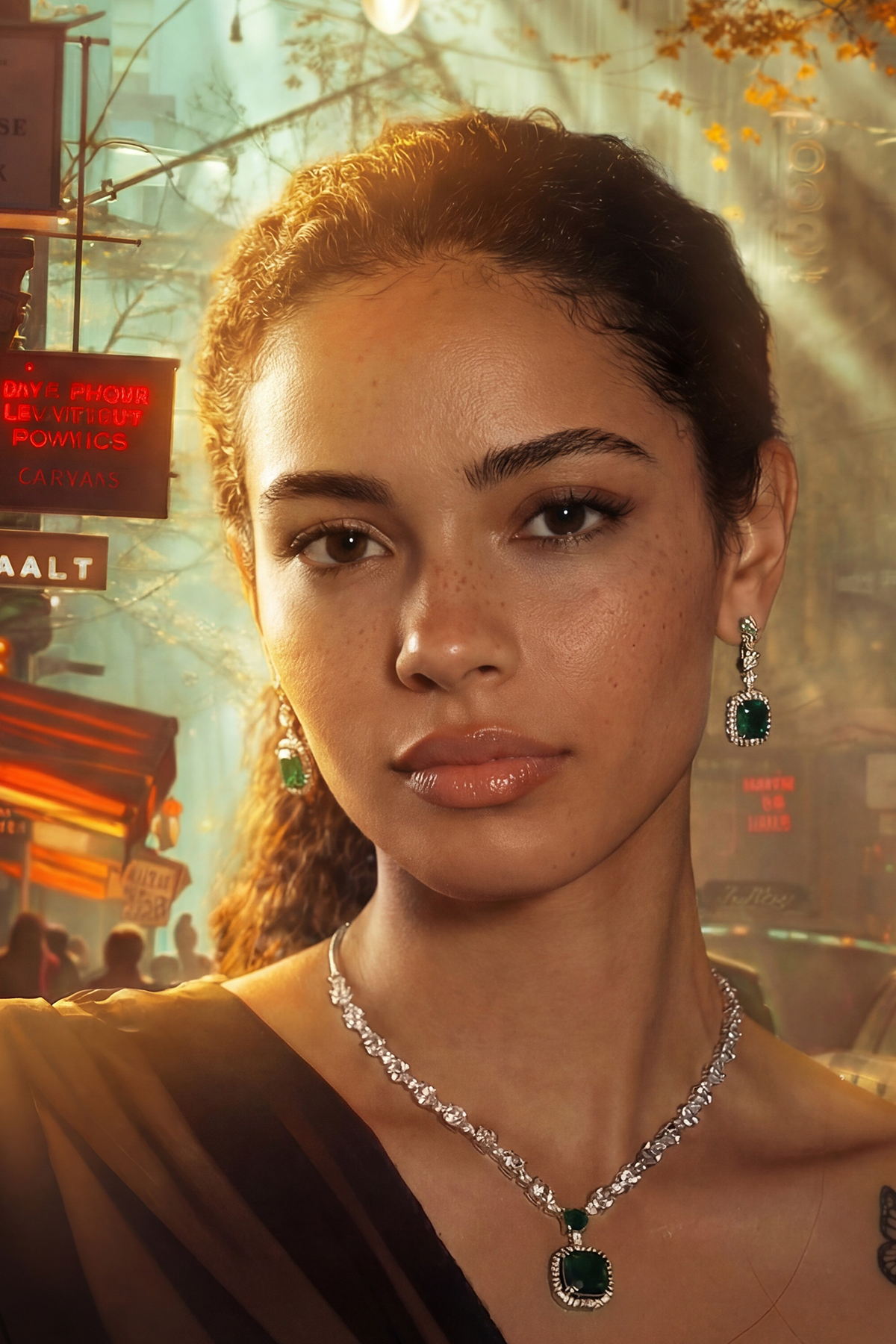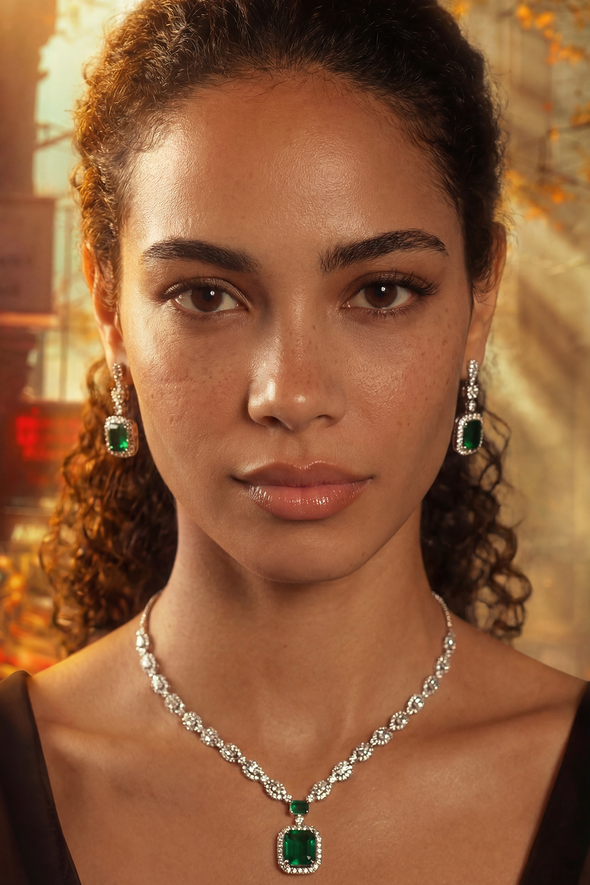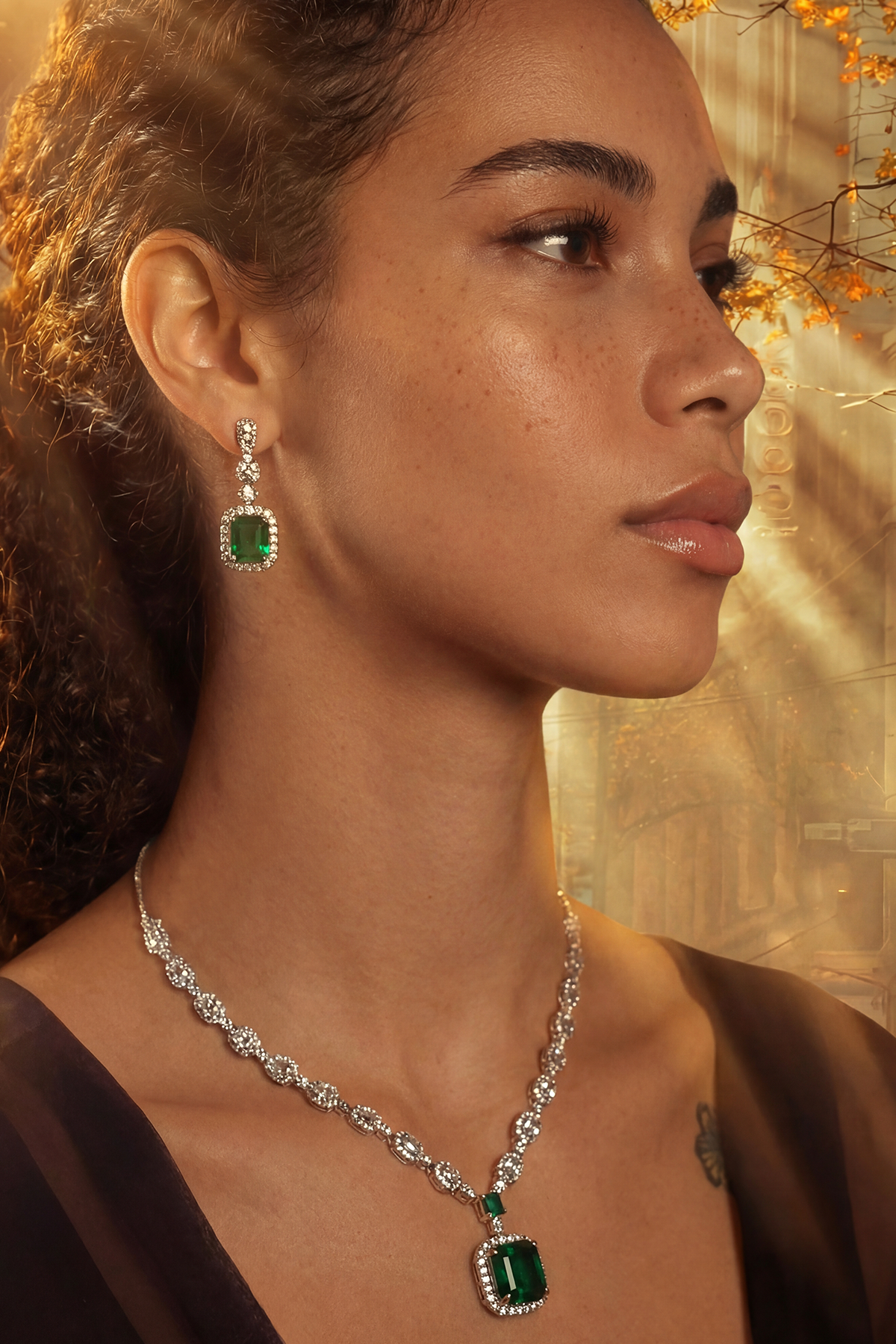 A tribute to clarity and brilliance. This set features emerald-cut stones encased in a halo of light, designed for the woman who carries her own glow. The deep forest greens and sharp geometric lines offer a sophisticated balance between antique charm and contemporary edge. Perfect for making a silent yet powerful statement at any formal gathering.