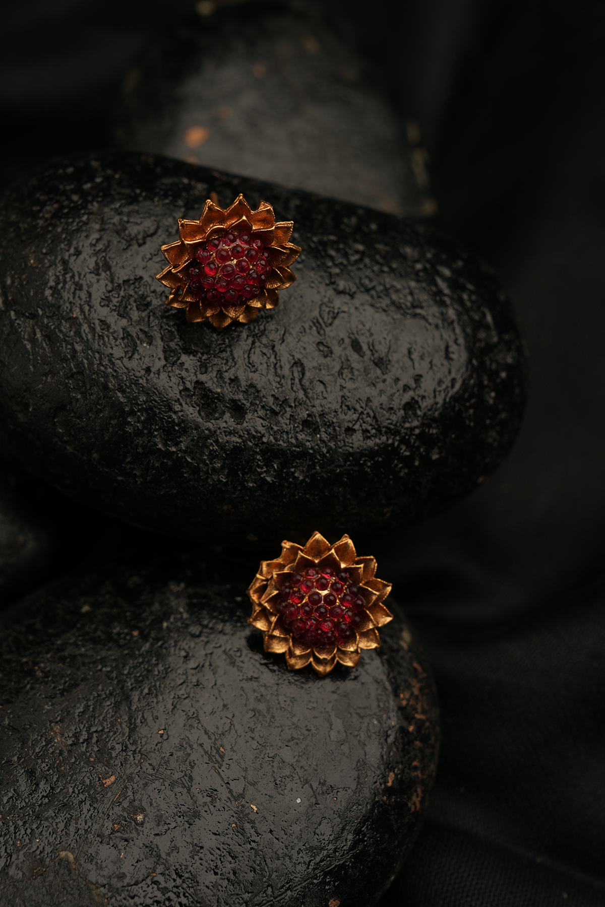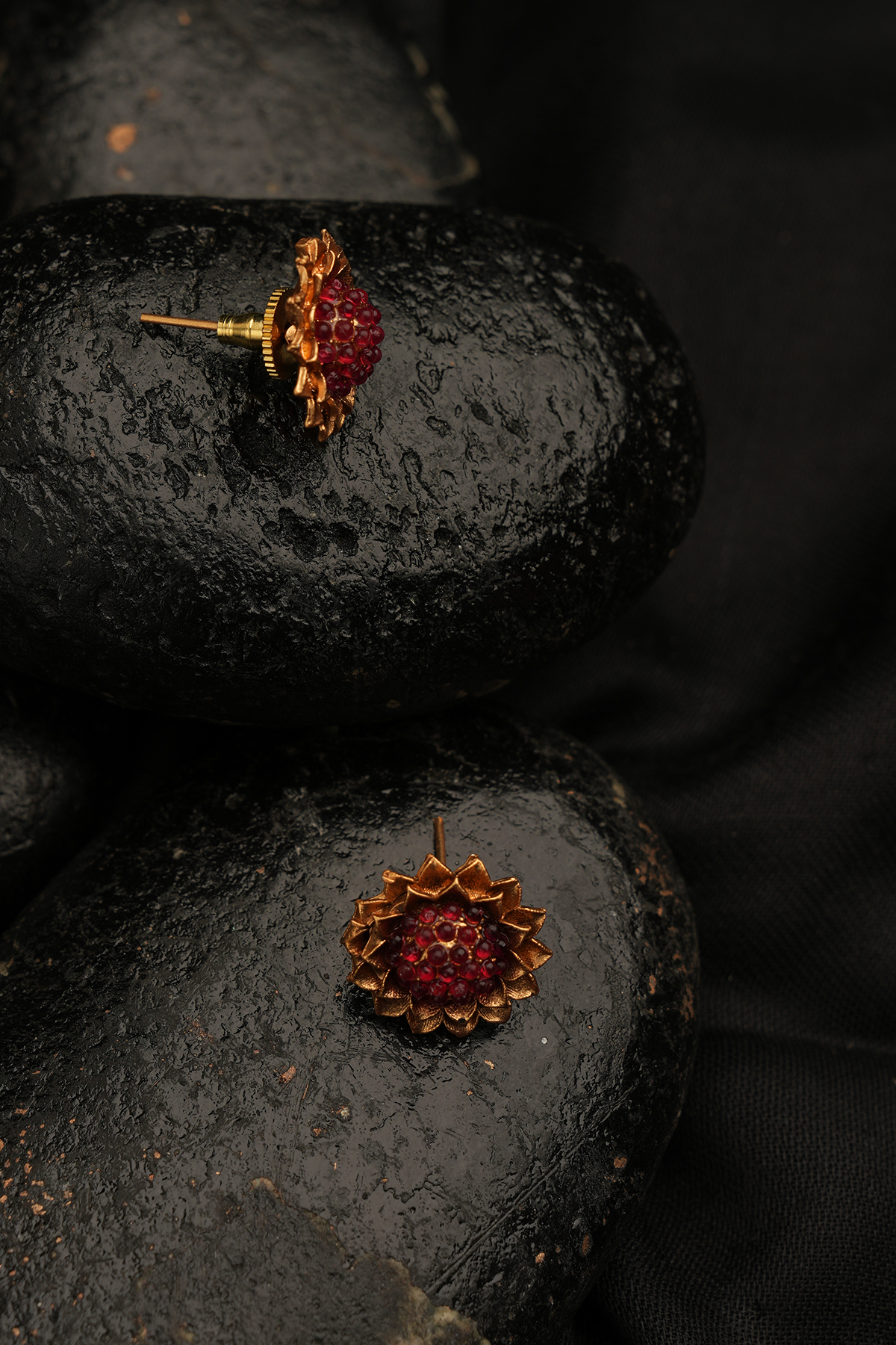 Gold earrings with intricate floral designs, highlighted by vibrant red gemstone centers, embodying elegance and sophistication.