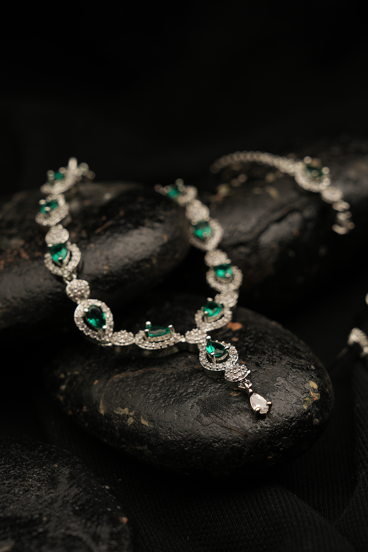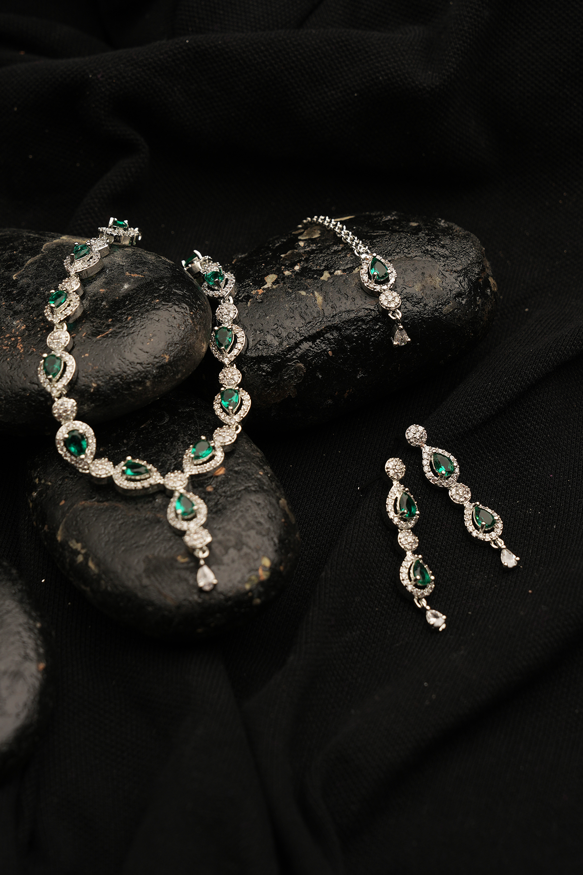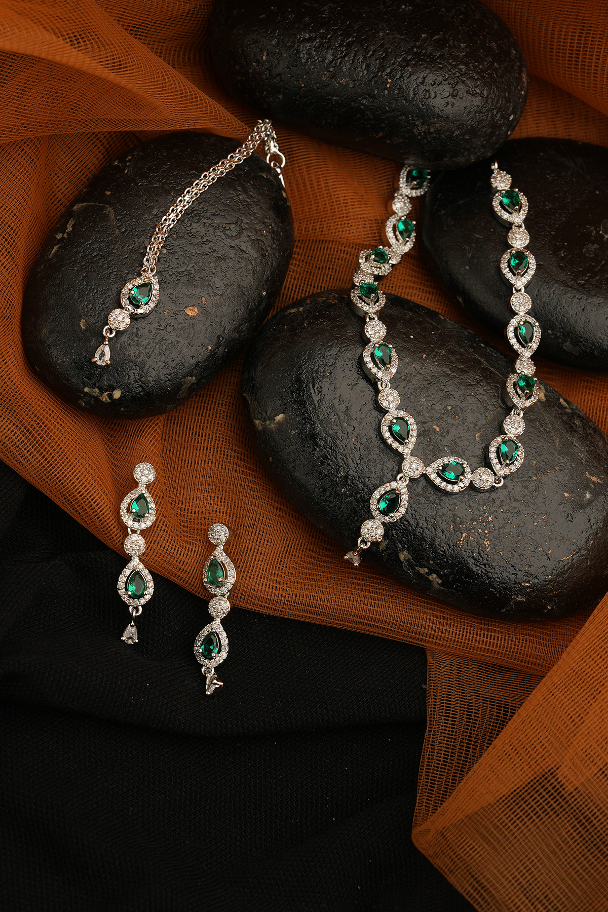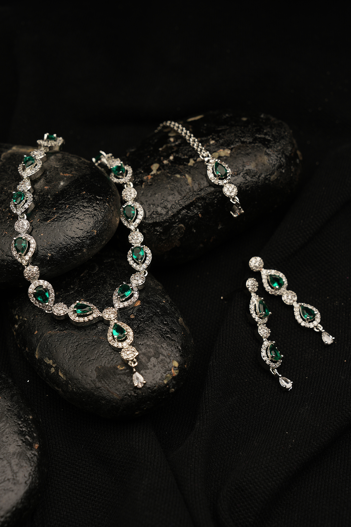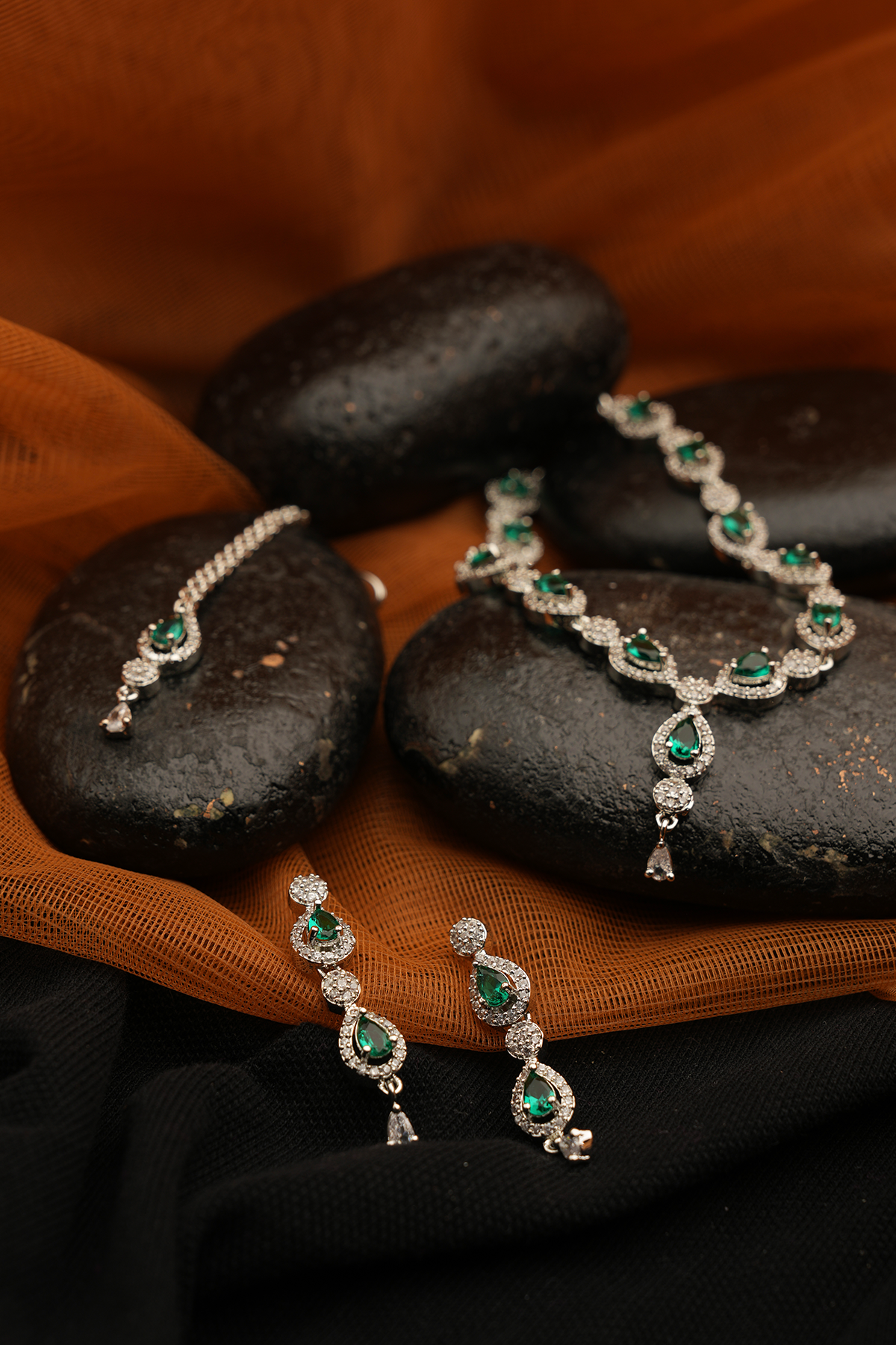 Stunning jewelry set with emerald-adorned necklace, tikka, and earrings, accented by clear stones for a touch of brilliance.